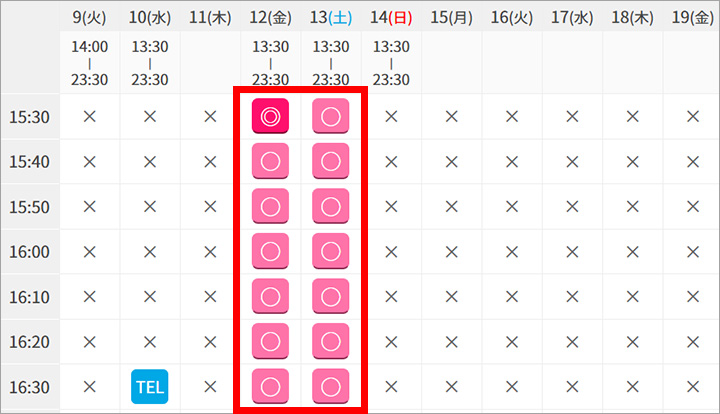 公式HP上ではキャストのその日の出勤予定時間帯は確認できますが、実際にどの時間帯が空いているのかは把握できません。そのためお客様からお問い合わせをいただいたものの、実際は空いておらずお断りをするケースが多々ありました。