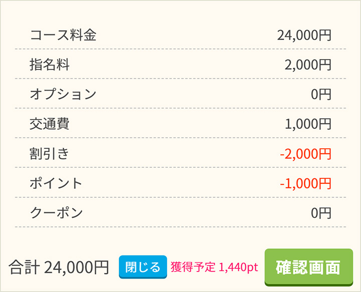 このようなクレームを防ぐため、【簡単予約】においては①コース料金②指名料金③オプション料金④ポイント利用⑤クーポン利用を全て正確に反映し、予約画面上でリアルタイムに総額料金をご確認いただける仕組みを採用いたしました。